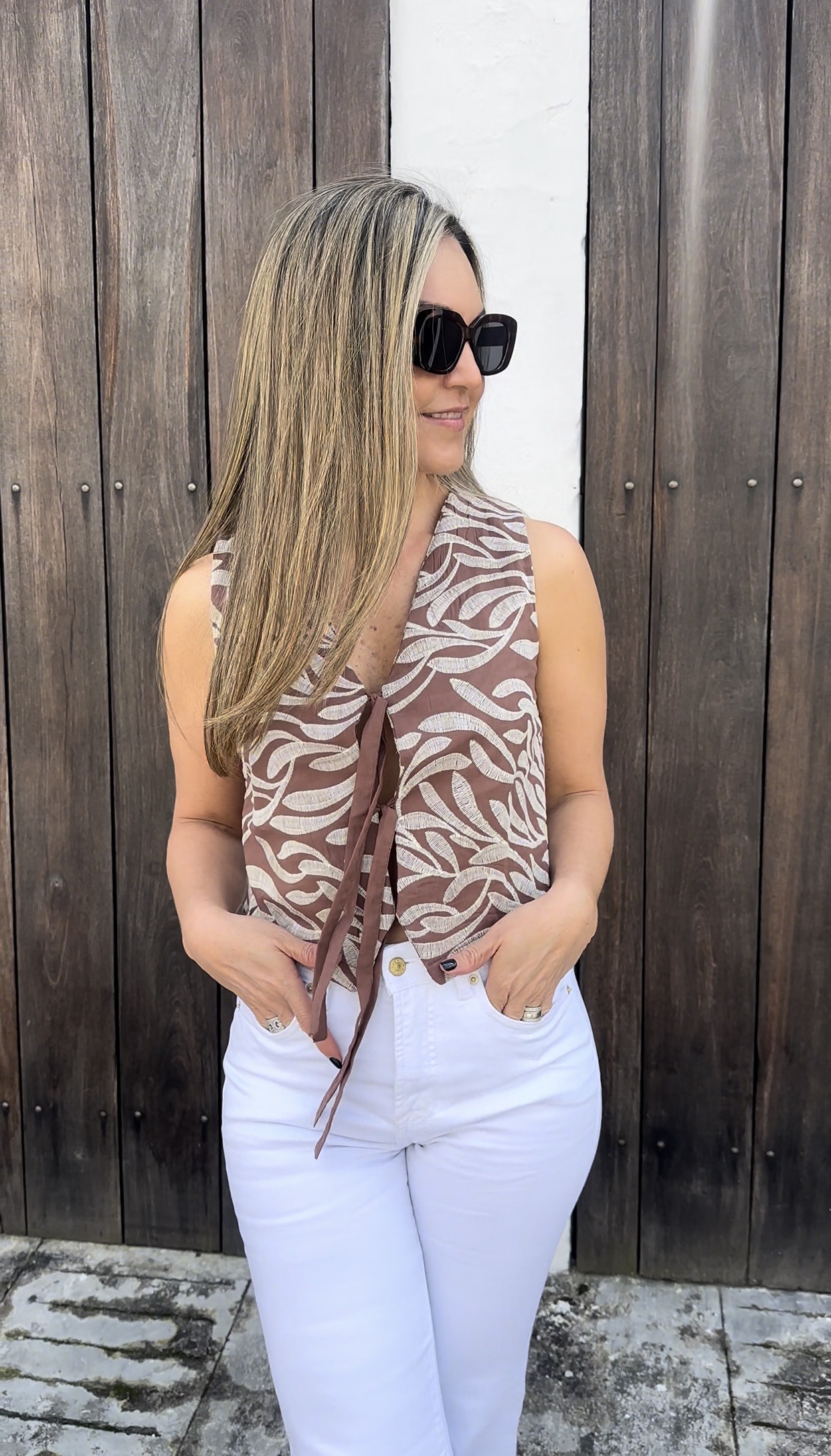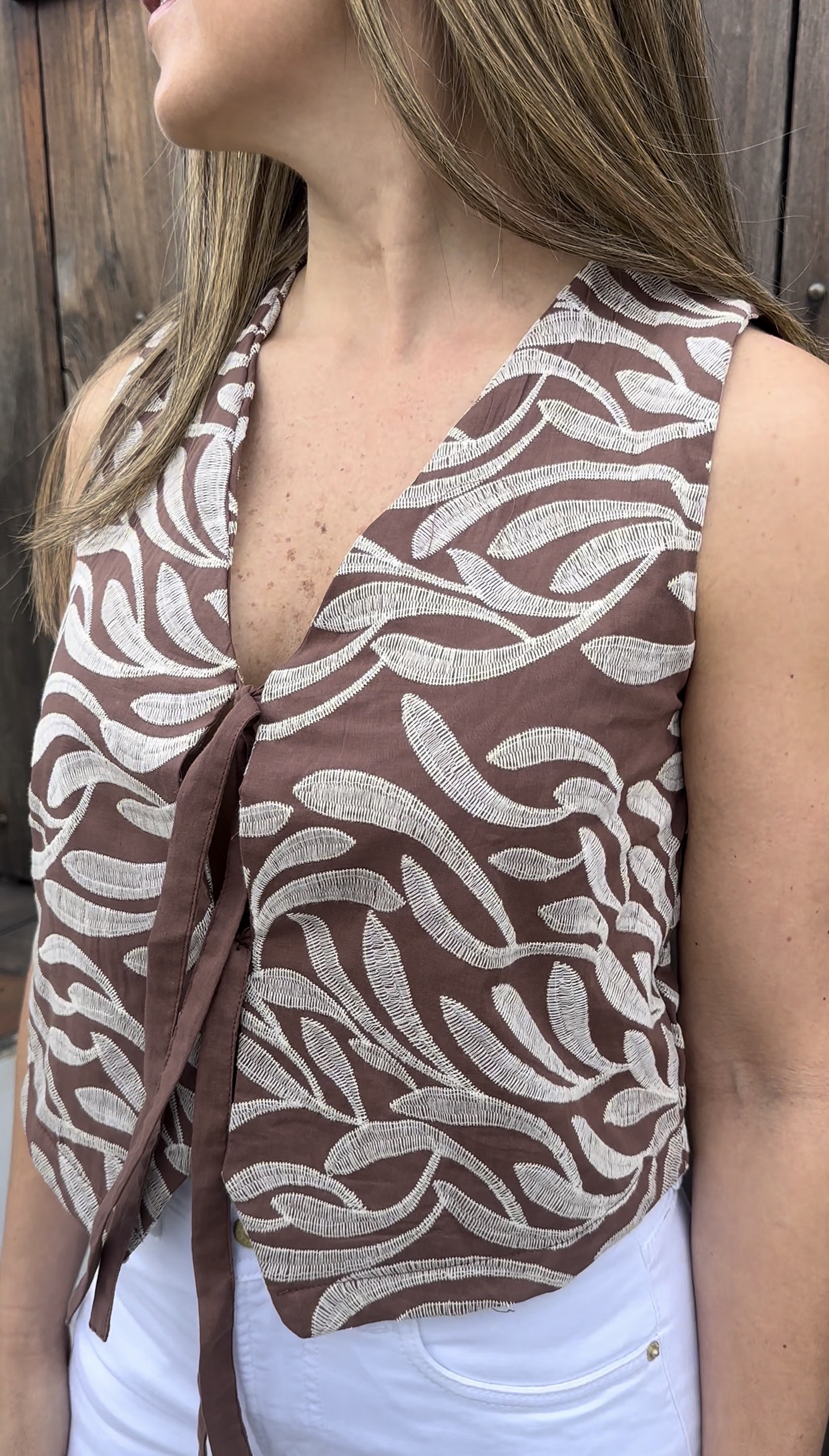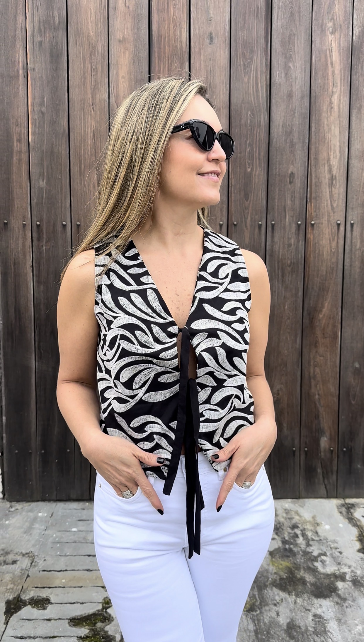 Presenta un delicado bordado en contraste que aporta textura y personalidad, acompañado de un corte limpio y estructurado que estiliza la silueta. Su diseño sin mangas lo convierte en una prenda versátil y atemporal, ideal para llevar solo o en capas, tanto en looks casuales como más elegantes.